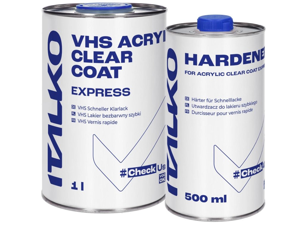 Italko VHS Akrylový čirý lak EXPRESS, profesionální VHS (Very High Solid) čirý lak, se vyznačuje mimořádně rychlou dobou schnutí, navržený pro efektivitu a maximální urychlení procesu lakování.